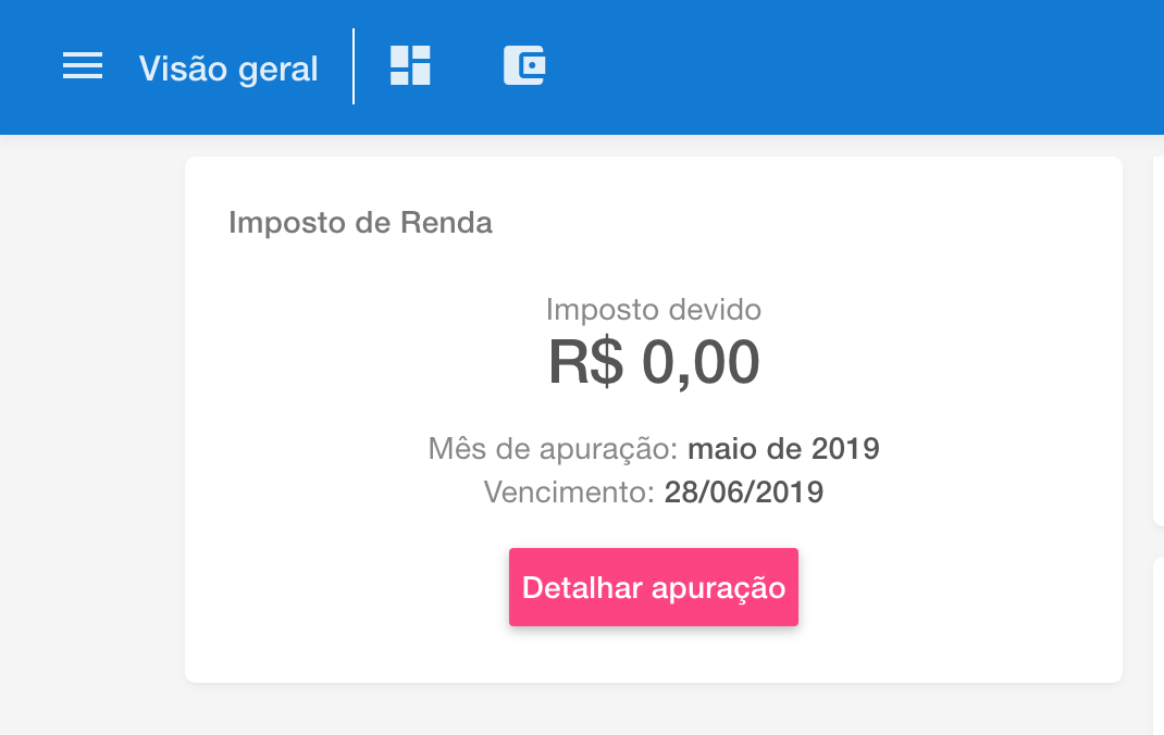 , que é exibido no painel de Imposto de Renda da Visão Geral ou na tela de Imposto de renda que pode ser acessar pelo menu de principal, conforme imagens abaixo.