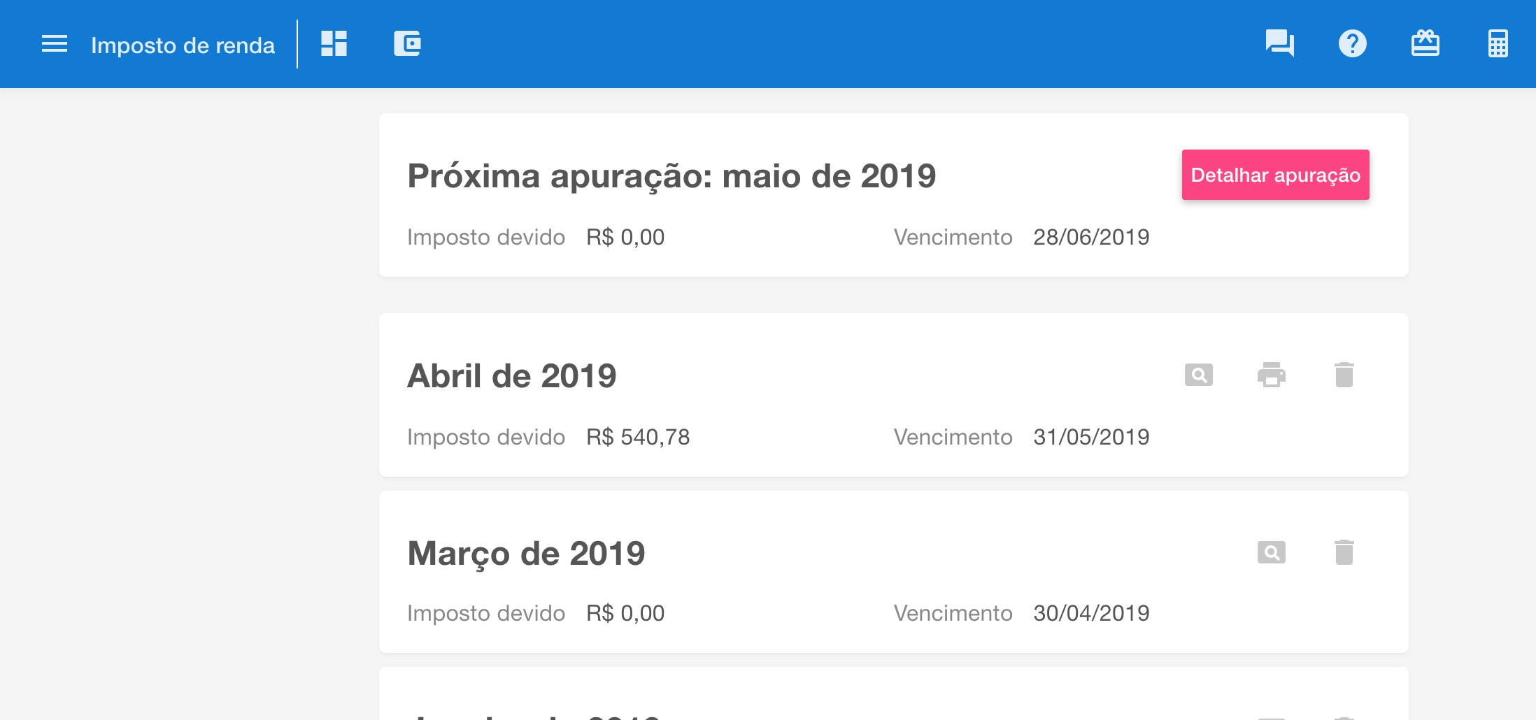 Para iniciar o processo de apuração de um determinado mês é necessário clicar no botão  , que é exibido no painel de Imposto de Renda da Visão Geral ou na tela de Imposto de renda que pode ser acessar pelo menu de principal, conforme imagens abaixo.
