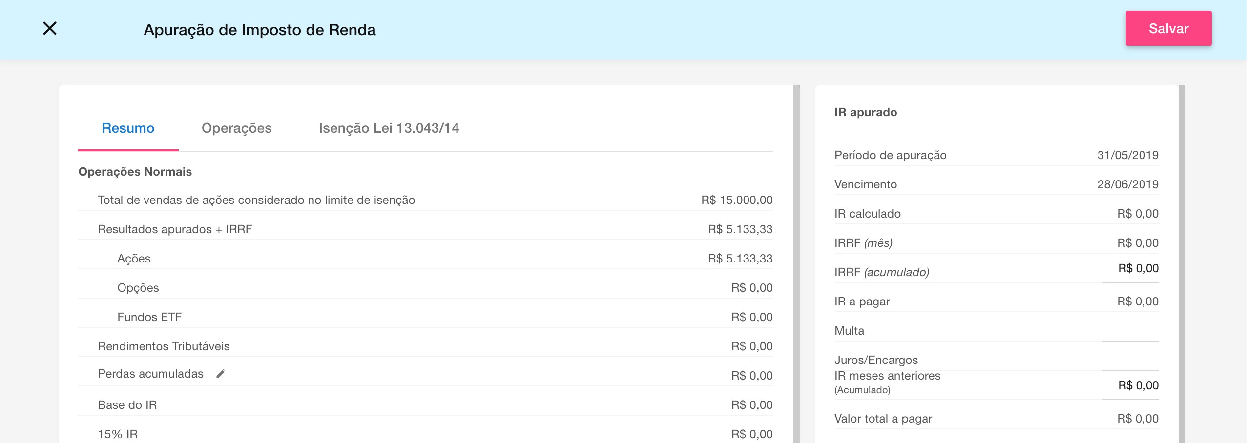 Para conclusão da apuração, basta conferir os valores na tela de resumo, informar a conta para o agendamento do pagamento do IR no contas a pagar, caso haja imposto a pagar, e clicar no botão Salvar.