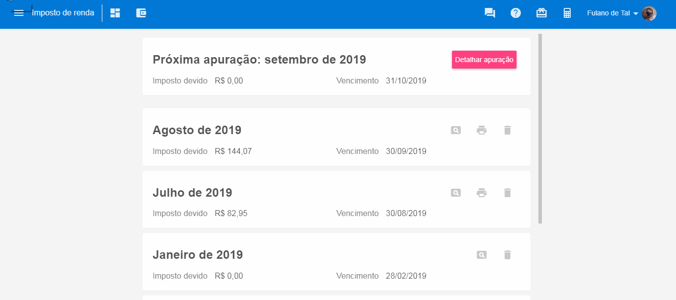 Na tela de imposto de renda é possível visualizar todas as apurações realizadas, bem como visualizar o detalhamento de cada apuração, excluir a apuração e reimprimir o DARF para pagamento do IR.